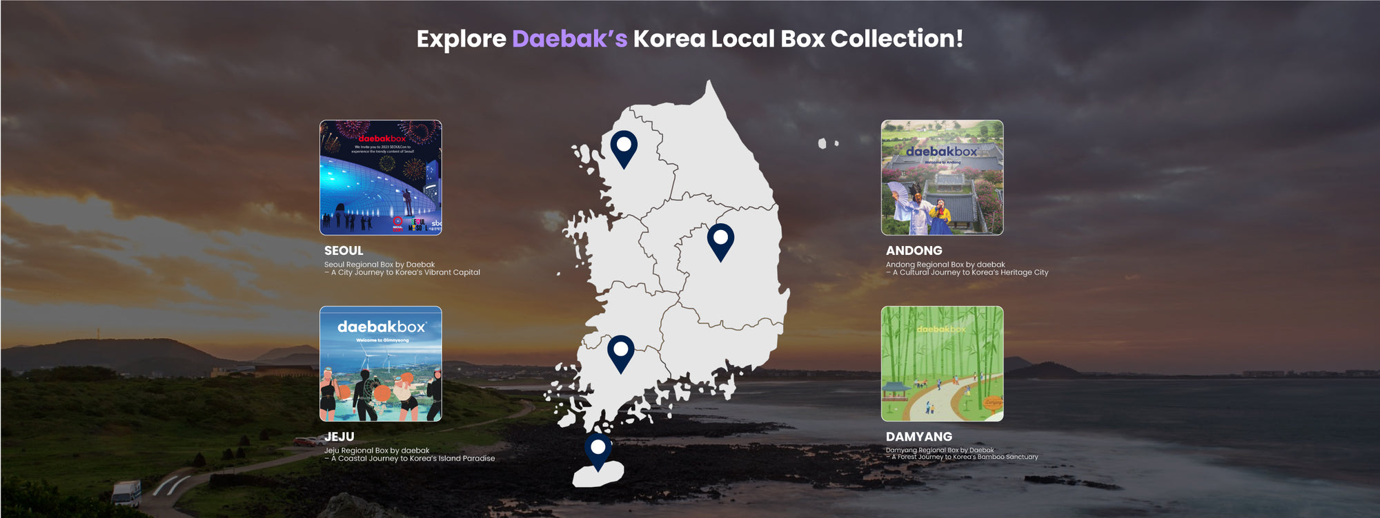 지역을 담은 디자인과 글로벌 크리에이터 협업, Daebak의 자체 글로벌 마케팅을 통해 박스를 자연스럽게 바이럴하며, 전 세계 소비자의 지역에 대한 관심을 증진시키고 궁극적으로 실제 방문과 참여를 유도합니다.